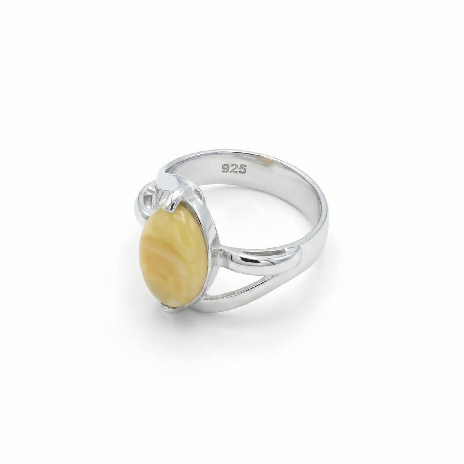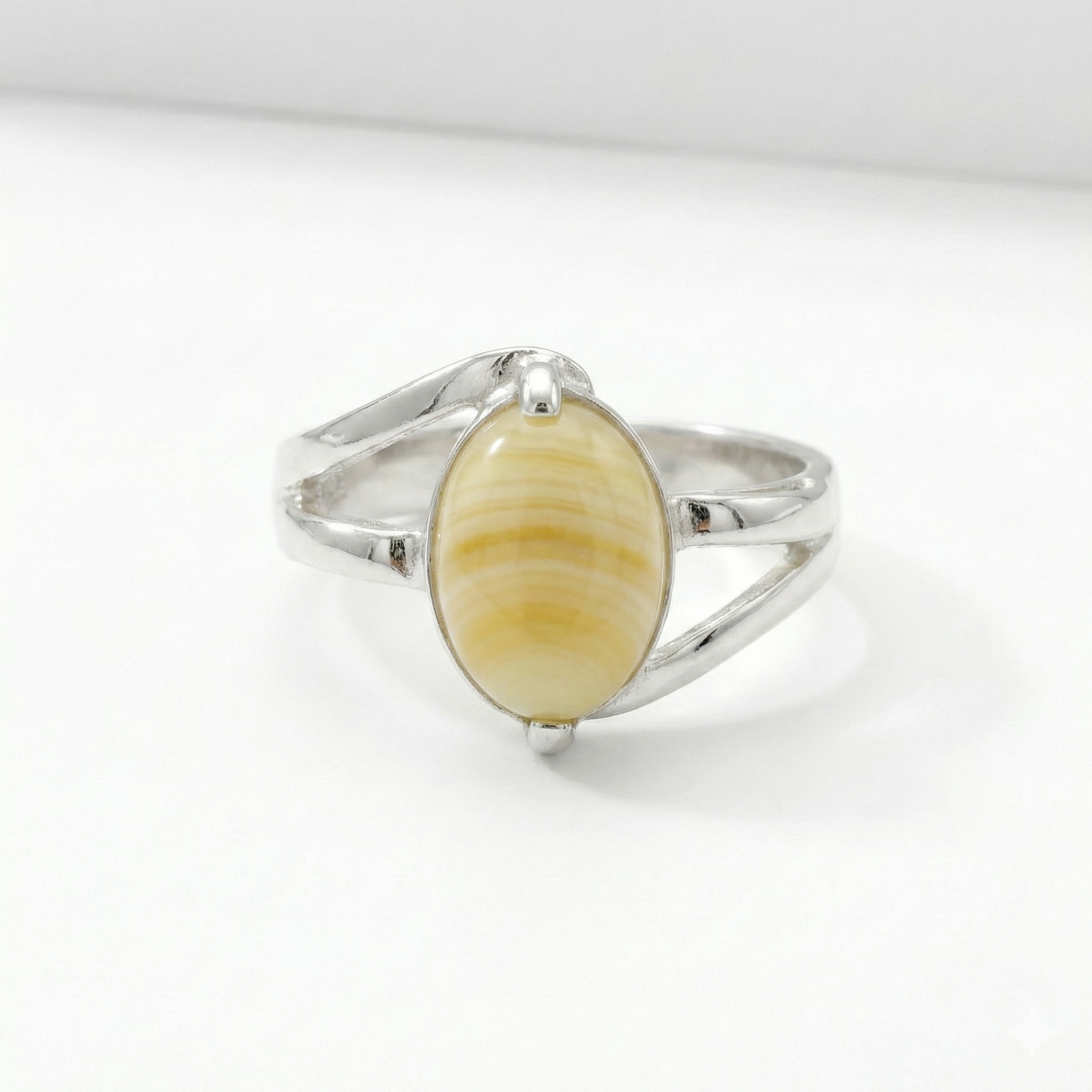 La esencia de la naturaleza en una joya única. Este anillo presenta una gema natural tallada en forma de cabujón ovalado, cuyas vetas y matices orgánicos aseguran que no existan dos piezas iguales. Su montura de banda dividida o «split shank» no solo aporta estabilidad a la piedra, sino que crea un diseño aireado y elegante que estiliza la mano.
