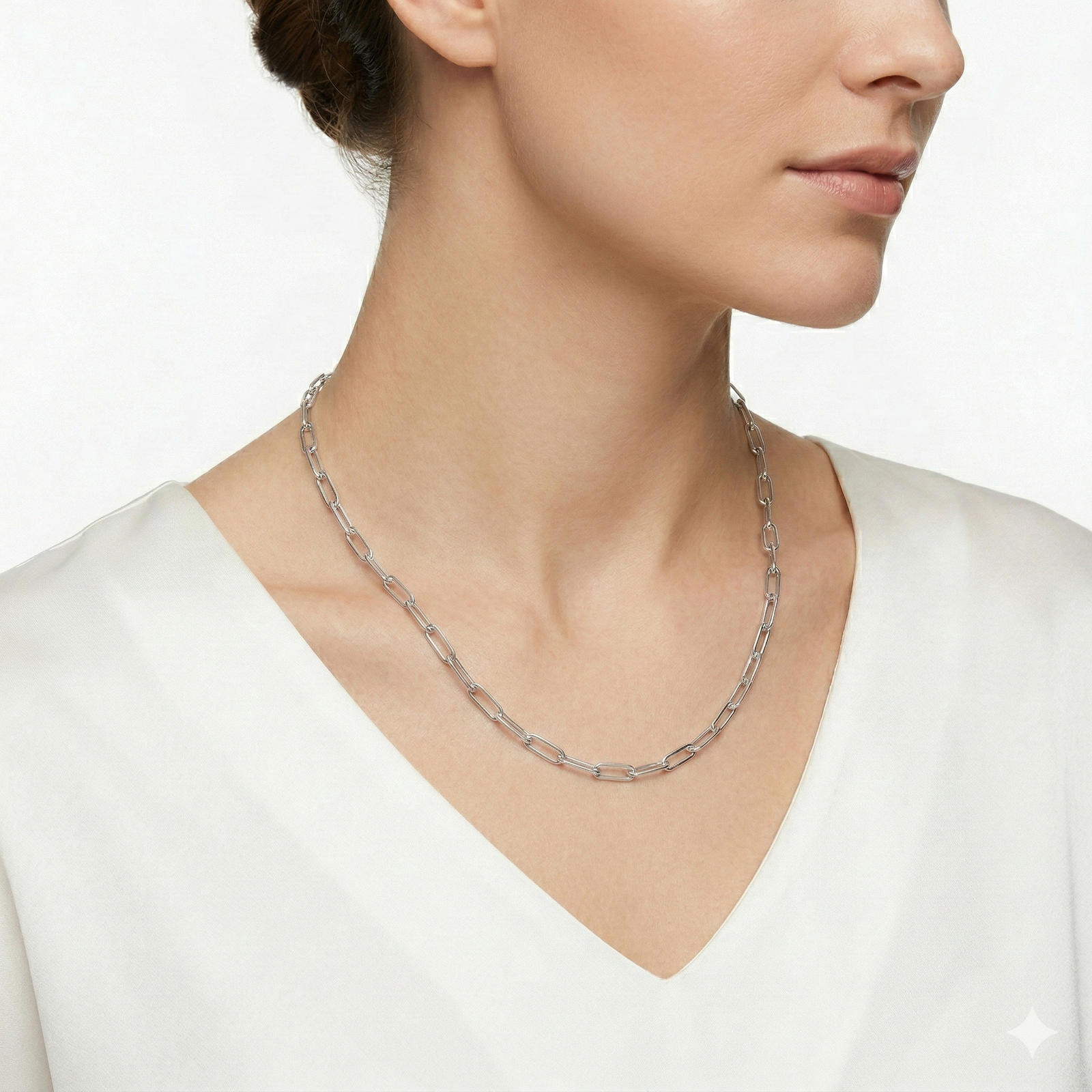 Su diseño de eslabones alargados ofrece un equilibrio perfecto entre delicadeza y presencia, convirtiéndolo en el accesorio ideal tanto para llevarlo solo como para crear capas (layering) con otros collares.